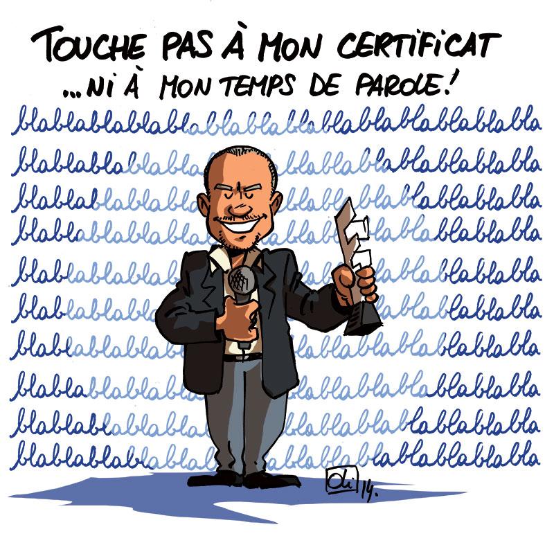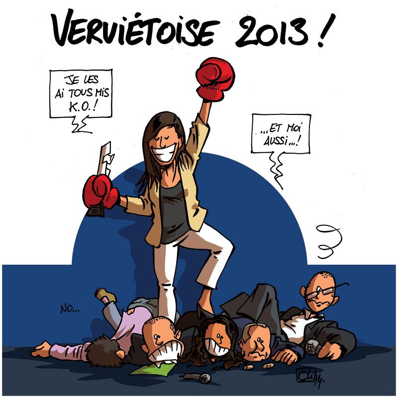 Le 5/02, au Grand Théâtre de Verviers, se déroulais la cérémonie pour décerner le prix du verviétois de l’année 2013. D’abord, ce sont les prix du citoyen, à Jean-Guy Chanteux de l’ASBL « touche pas à mes certificats verts », du manager, à Richard Teply, du sportif, à la boxeuse Céline Iglésias, et de l’artiste, à la chanteuse Wendy Nazaré, qui ont été décernés. Le verviétois de l’année, qui était une verviétoise, a logiquement été l’un des ces candidats, et c’est la boxeuse theutoise, Célin Iglésias qui est repartie avec le prix ! Si elle est restée sans voix, son collègue Jean-Guy Chanteux ne s’est pas privé pour peaufiner la communication pré électorale de son ASBL ! La cérémonie s’est ponctuée des prestations artistiques de Renaud Ruten, Martin Charlier (Kiki l’innocent) ou encore Wendy Nazaré. La soirée était retransmise en direct sur Télévesdre et soutenue par La Meuse, Vlan, Securex et Vivacité. Dessin pour La Meuse – Verviers