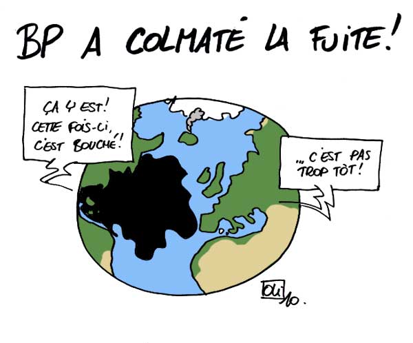 Cette fois, il semblerait que plus une seule goutte de brut ne s’échappe de la fuite. Malheureusement, ce n’est qu’un test et le véritable bouchon/entonnoir ne sera mis que plus tard… Il est temps que ça cesse, non ?