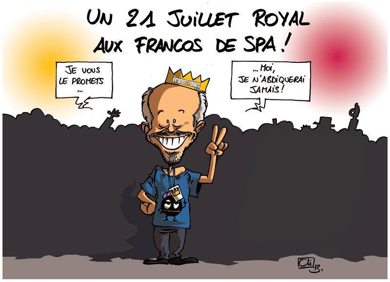 Les Francofolies de Spa battent leur plein, sous le soleil, la chaleur, la fête et la bonne musique ! Mais en plus, le 21 juillet, jour de fête nationale, le festival se mettra aux couleurs noires, jaunes et rouge pour célébrer l’abdication du roi Albert II, le couronnement de Philippe et les 20 ans du festival ! Charles Gardier, co-président du festival, ne semble, quant à lui, pas vraiment prêt d’abdiquer 😉