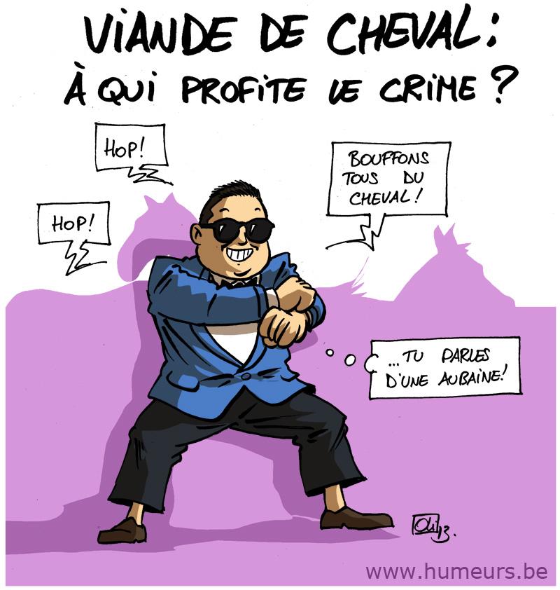 La Belgique n’aura pas été épargnée très longtemps par la crise européenne sur la viande de cheval ! En effet, des centaines de chevaux, impropres à la consommation, malades ou destinés à l’abattage, ont terminé dans les assiettes belges ! L’AFSCA suit l’affaire depuis 2011 déjà. Alors, que reste-t-il de fiable dans nos assiettes ? A qui profite le crime ? En tout cas, ce qui est sûr, c’est qu’on n’a pas fini d’en entendre parler, de la viande de cheval ! De là à imaginer que le chanteur coréen Psy soit à la base de ce phénomène, pour promouvoir son tube « Gangnam Style », 100% pur sang, il n’y a qu’un saut d’obstacle, que nous ne franchirons pas 😉