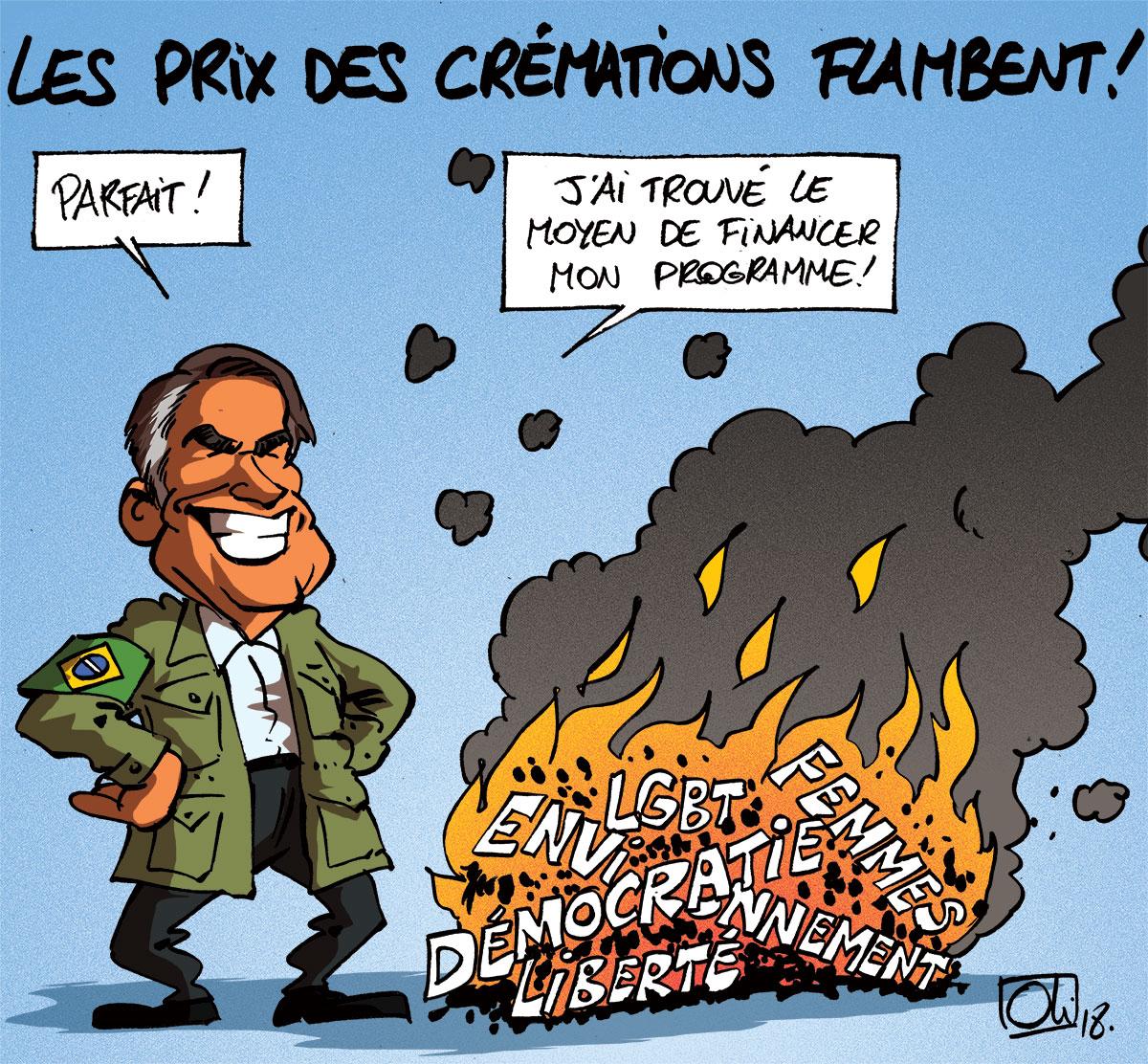 Alors qu’on constate une grosse augmentation des prix des crémations en Belgique, au Brésil, l’extrême droite de Jair Bolsonaro a remporté les élections et pris le pouvoir. C’est donc un président militariste, misogyne, homophobe, peu regardant sur l’environnement et pro Trump qui a pris les rennes du pays.
