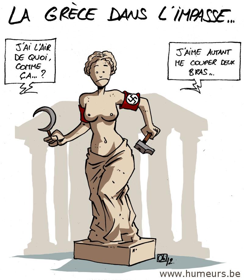 La Grèce continue d’aller de Charybde en Scylla : les élections ont donné des résultats très extrêmes, propulsant au devant de la scène, au côté des partis traditionnels (qui ont vu leur popularité fortement baisser) des partis d’extrême gauche et des néo-nazis. Les tentatives pour former un gouvernement échouent les unes après les autres. Alors, devront-ils revoter ? Le Belgique a bien tenu un an et demi…