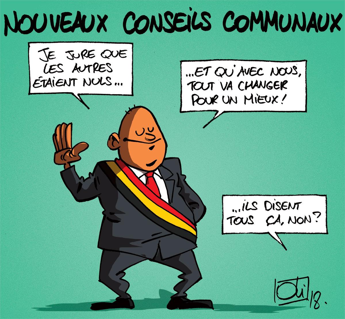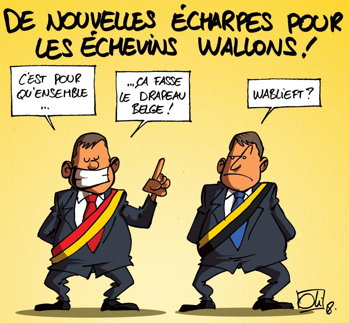 Les échevins wallons auront de nouvelles écharpes dès janvier 2019, aux couleurs de la Wallonie, jaune et rouge, à la place de jaune et noir ! Celles-ci coûteront entre 200 et 1000€. Avec près de 1000 échevins, cela coûtera donc au moins 200000€ au contribuable.