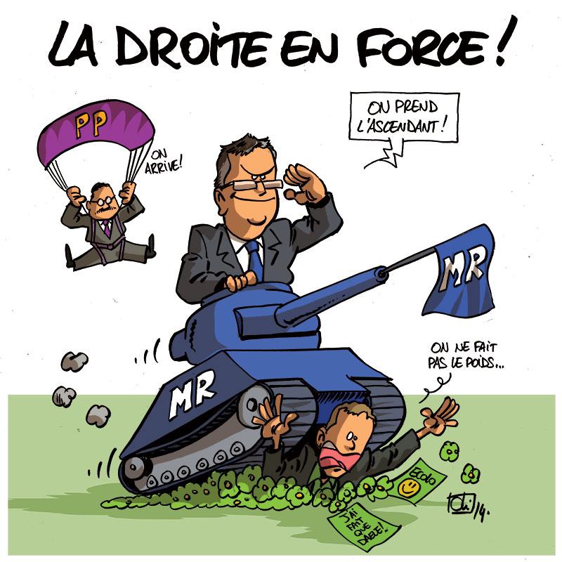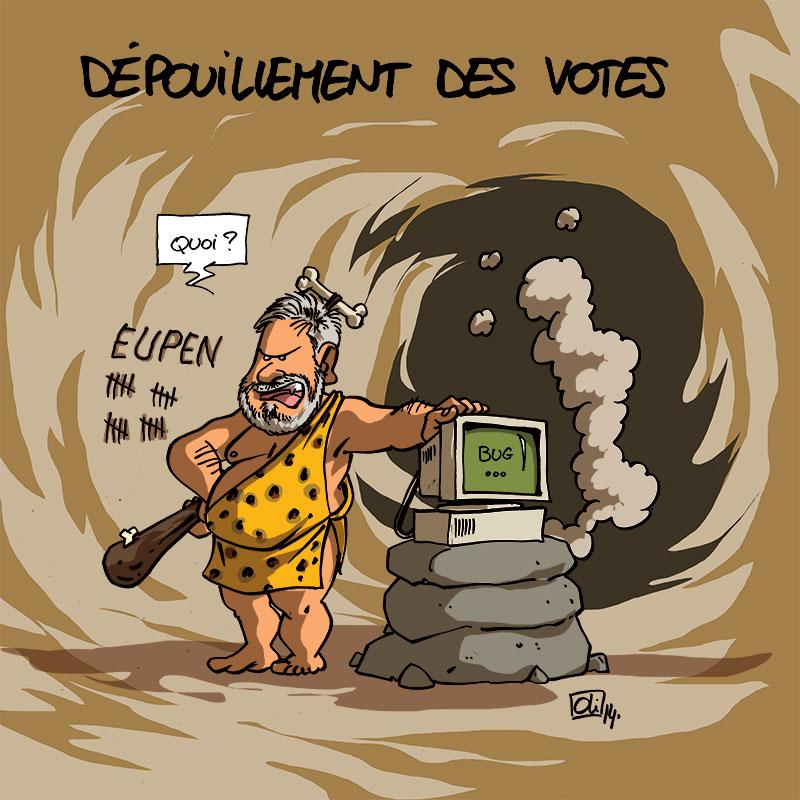 Les élections 2014, fédérales, régionales et européennes, se sont achevées hier, et les résultats sont partiellement connus, malgré de gros soucis au niveau du vote électronique ! En effet, un bug empêcherait le décomptage des voix. Alors, le retour du papier ? Voici les dessins parus dans La Meuse Liège et La Meuse Verviers ! Le MR cartonne dans la région liégeoise, le PTB progresse de manière fulgurante, et écolo se prend la dégelée de sa vie…