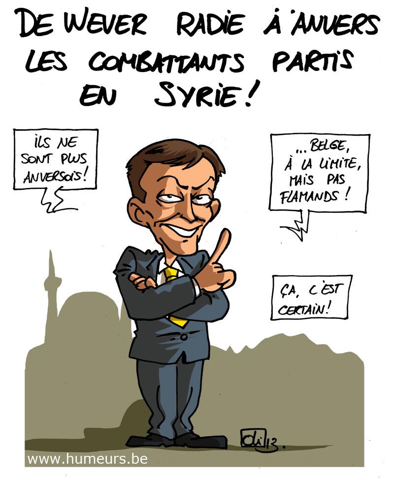 Le bourgmestre d’Anvers, le président de la N-VA Bart De Wever, a décidé d’agir à son échelle par rapport aux départs en Syrie de jeune anversois. Il a annoncé les radier administrativement de la ville, ce qui signifie qu’ils n’auront plus d’adresse dans la commune, ni de droits sociaux. A sa manière, De Wever essaye de faire réfléchir les jeunes… ou alors, c’est une nouvelle tentative de se montrer plus efficace que les ministres de l’intérieur, des affaires étrangères ou de la justice… Allez savoir !