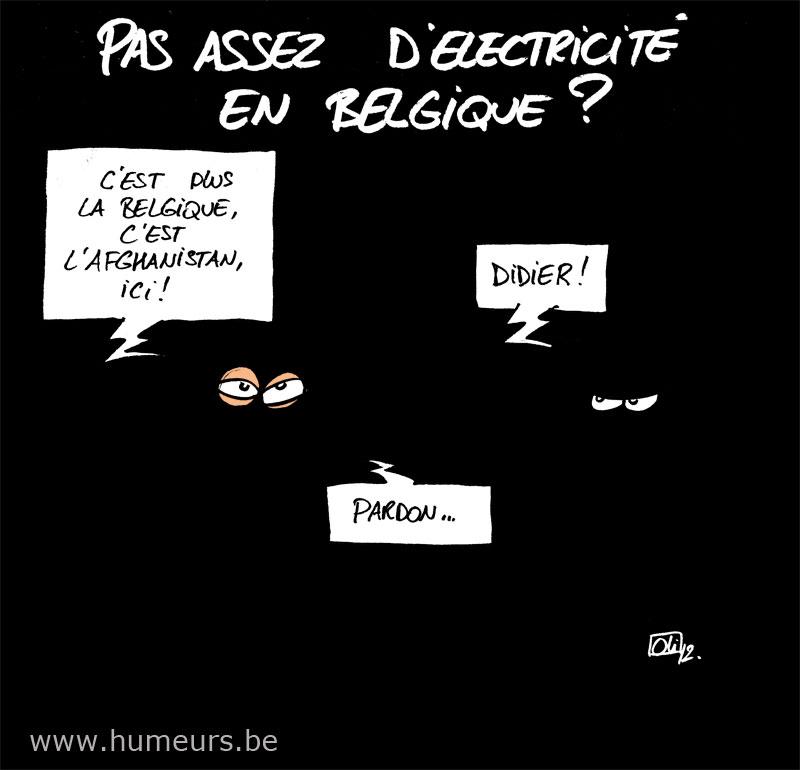 D’après une étude rendue au gouvernement à propos de la production d’électricité en Belgique, il y aura un manque d’électricité dès 2015. L’arrêt pur et simple des centrales et l’absence de mise en place de solutions de remplacement en est la cause principale. De là à ce que l’on compare la Belgique (ou Molenbeek) à l’Afghanistan (ou l’étranger), il n’y a qu’un pas… que peu oseraient franchir ! Alors, l’électricité, une affaire de ministère des affaires étrangères ? 😉
