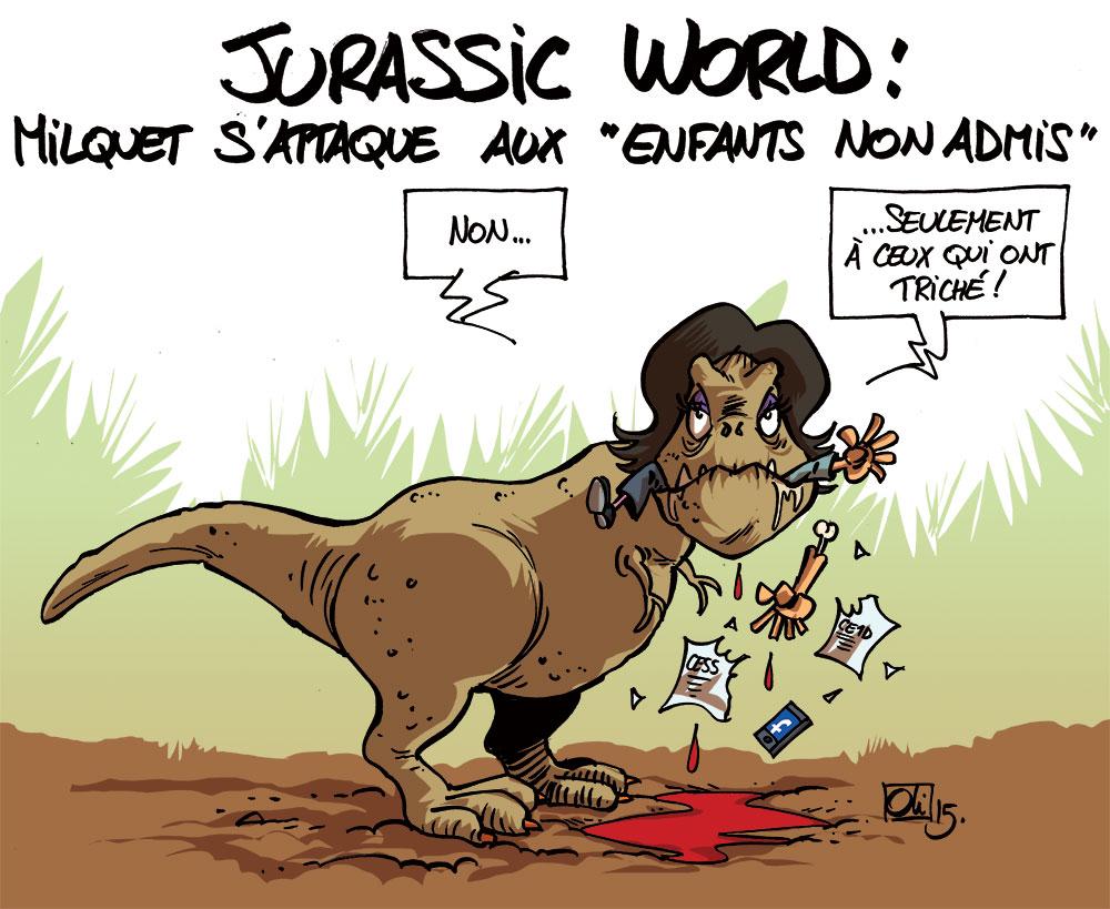 La ministre de l’éducation, Joëlle Milquet, s’attaque à la classification dépassée « enfants non admis », toujours en application sur certain films. Le dernier en date, Jurassic World, se voit « ENA » dans certaines salles, alors que dans d’autres, les enfants sont admis, se référant à une loi du début du siècle dernier ! Et pendant ce temps là, la chasse aux sorcières est ouvertes, et les sanctions risquent d’être sévères sur les fraudeurs ayant menés à la fuite des questions d’examens ! Alors, les dinosaures sont de sortie ?