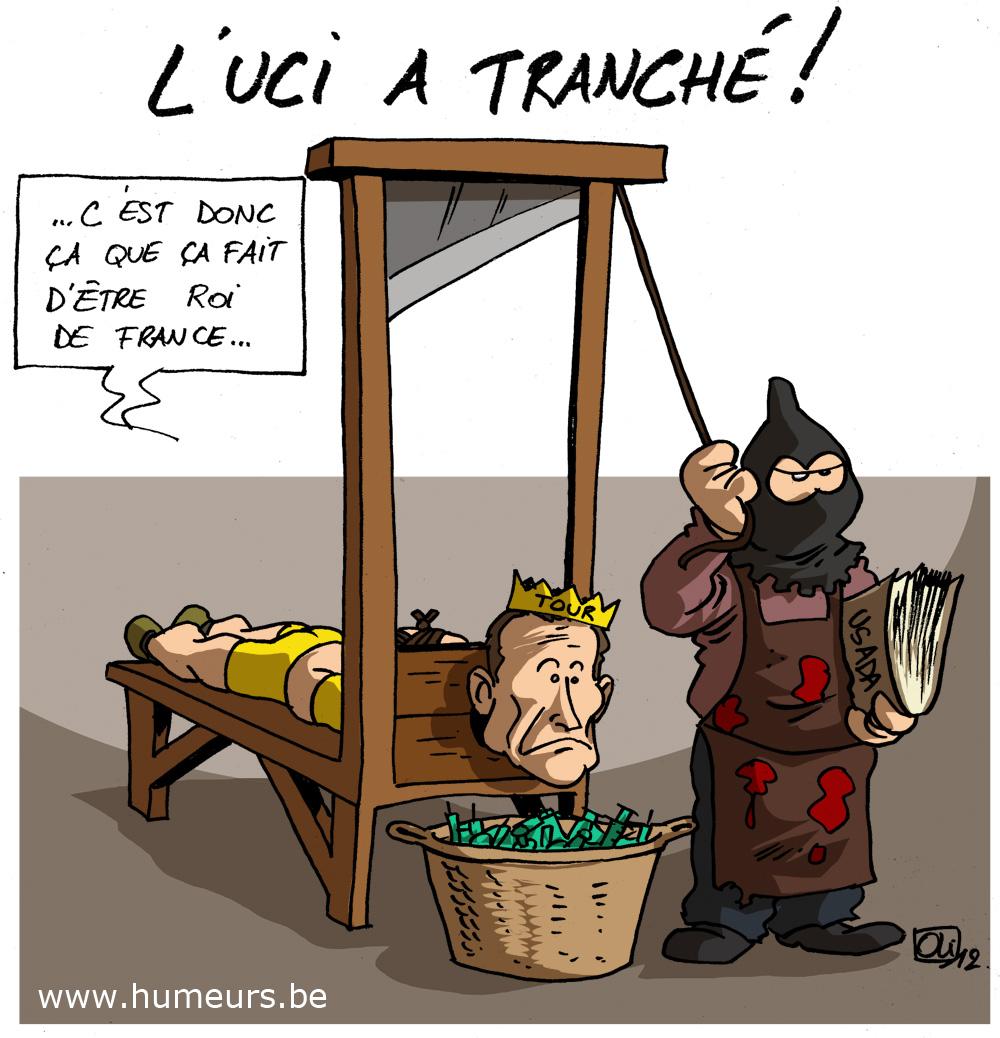 C’est tombé hier, l’UCI s’est rangée aux côtés du rapport anti-dopage de l’USADA, et a déchu le coureur cycliste Lance Armstrong de ses 7 victoires du Tour de France ! Le texan perd tout, y compris ses sponsors, et voit se pointer d’autres procès pour récupérer les sommes reçues ! Là, c’est vraiment la fin, le roi Armstrong est décapité…
