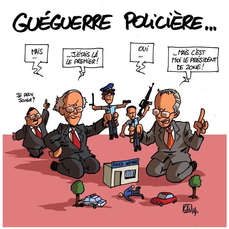 Les bourgmestres de Dison, Yvan Ylieff (PS), et de Verviers, Marc Elsen (cdH), se chamaillent quant à la nomination du prochain chef de corps de la zone de Police Vesdre. Le premier soutien l’actuel commissaire, Marcel Simmonis, ancien gendarme, et le second préfère Marc Adans-Dester, ex-chef de la Police de Verviers. Même Claude Desama, précédent bourgmestre de la ville de Verviers, se porte au secours d’Yvan Ylieff ! Les guéguerres pré-électorales semblent déjà se dessiner… Dessin paru dans La Meuse Verviers.