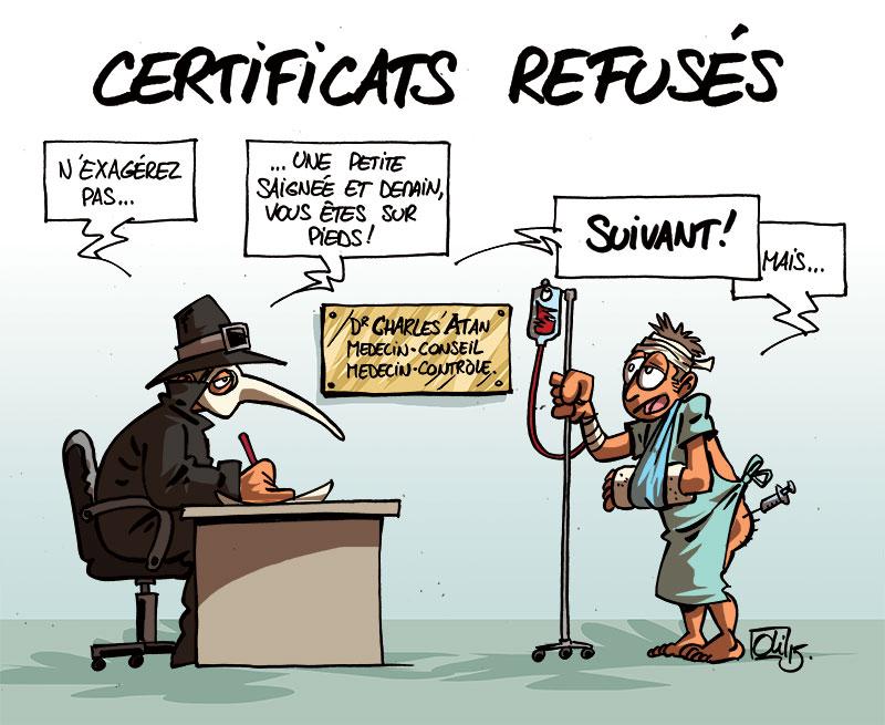 Le dessin pour Sudpresse ! 10% des salariés sous certificats sont remis au travail. Les médecins-contrôle et conseil cassent de plus en plus de certificats. Vous en avez déjà fait les frais ?