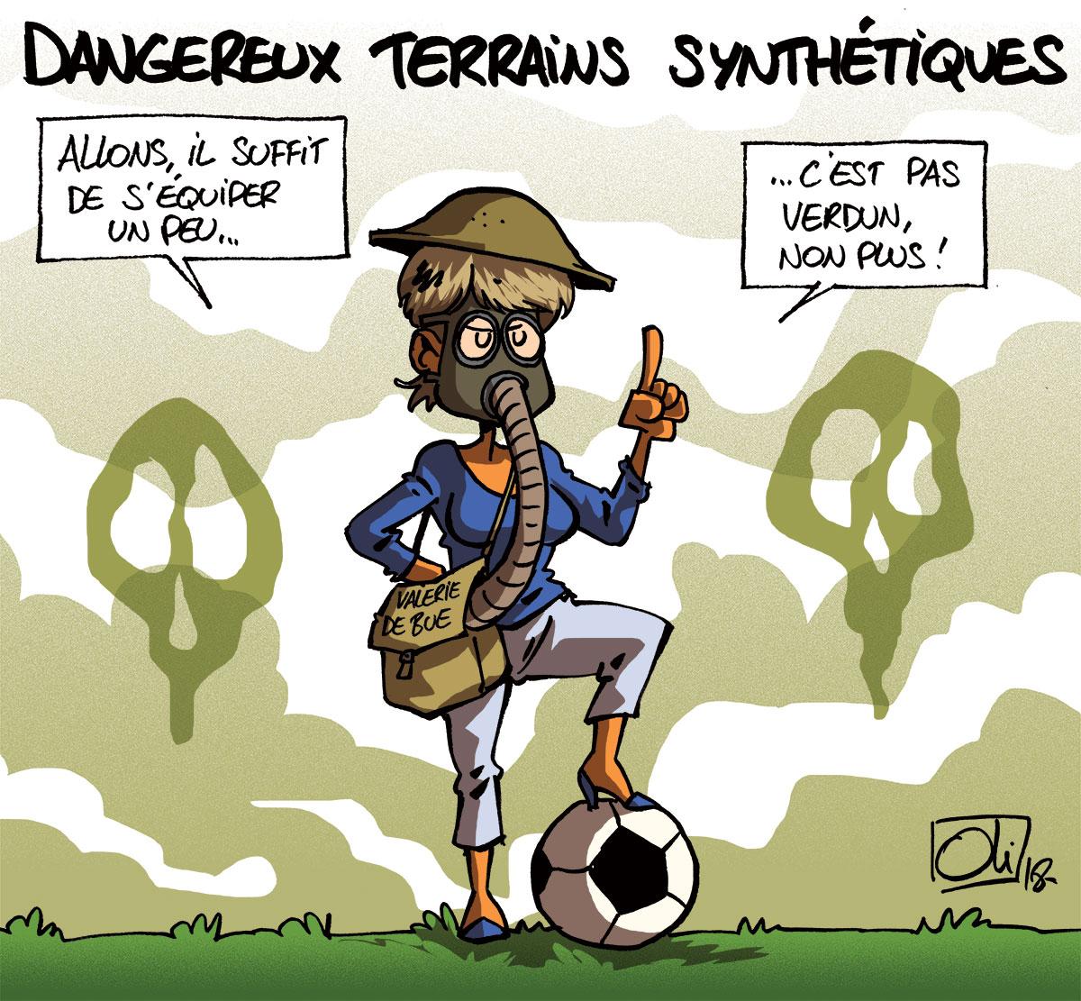 Terrains de sport synthétiques : dangers ! La ministre Valérie De Bue a eu beau faire une conférence de presse sur la sécurité des terrains de sport synthétiques, il n’empêche que (justement) celui sur lequel elle s’est exprimée doit être démantelé pour raisons sanitaires…