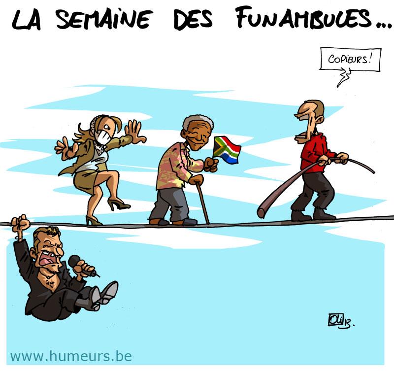 C’est décidément la semaine des funambules ! Nik Wallenda vient de réussir l’exploit de traverser le Grand Canyon sur un câble, soit plus de 450m, sans harnais ! Mais son exploit est quelque peu éclipsé par l’état critique de l’ancien président sud-africain, Nelson Mandela, qui, à 94 ans, souffre d’une infection pulmonaire. De son côté, Delphine Boël attend de savoir si sa demande d’identification ADN sera reçue ou non. Quant à Johnny Hallyday, l’infatigable idole des jeunes (et des moins jeunes), est toujours sur le fil…
