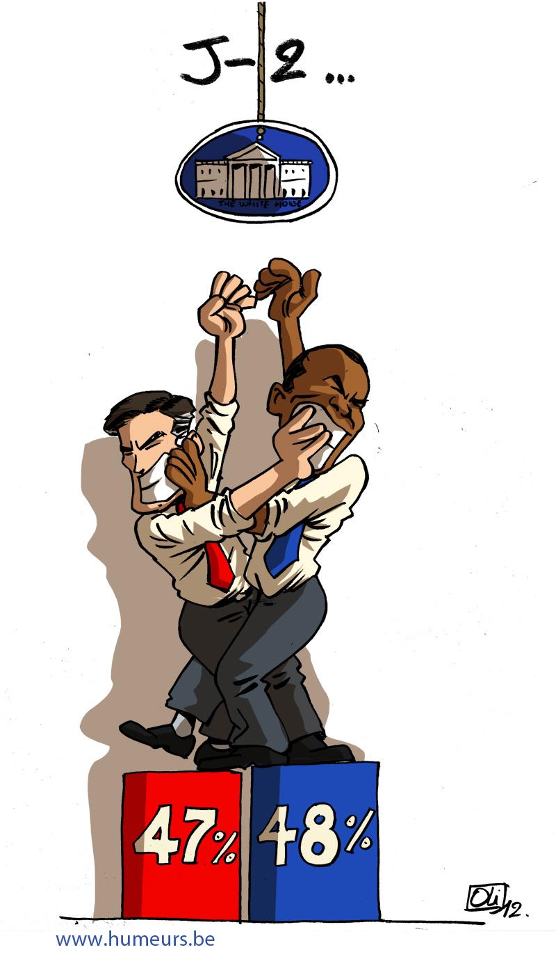 A deux jours de l’élection présidentielle aux USA, Obama et Romney sont au coude à coude dans les sondages, puisqu’on estime à 48% les intentions de votes pour Obama et 47% à Romney ! Rien n’est fait et, aux dires des échos aux Etats-Unis, il s’agirait des élections les plus serrées depuis de longues années !