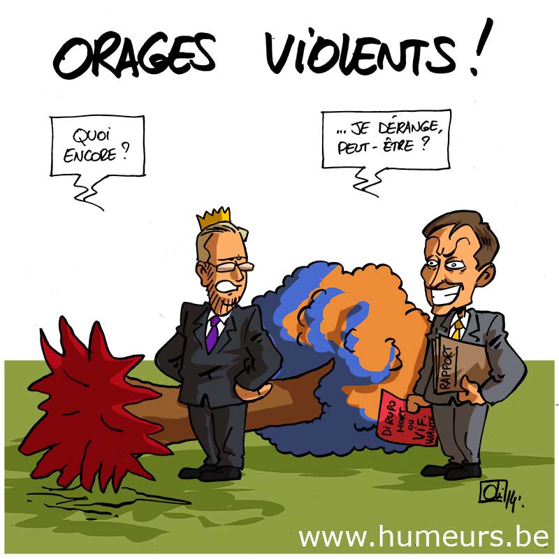 Le temps est lourd et chargé d’orages, ces derniers jours ! Liège et le Hainaut sont les provinces les plus touchées ! Sale temps pour le premier ministre, Elio Di Rupo, qui ne parvient pas à se concentrer sur kl’essentiel, à savoir le budget ! Avec les affaires Boël, l’abdication du roi, les jeunes partis en Syrie, la modification de la loi sur l’euthanasie, il ne sait plus où donner de la tête !