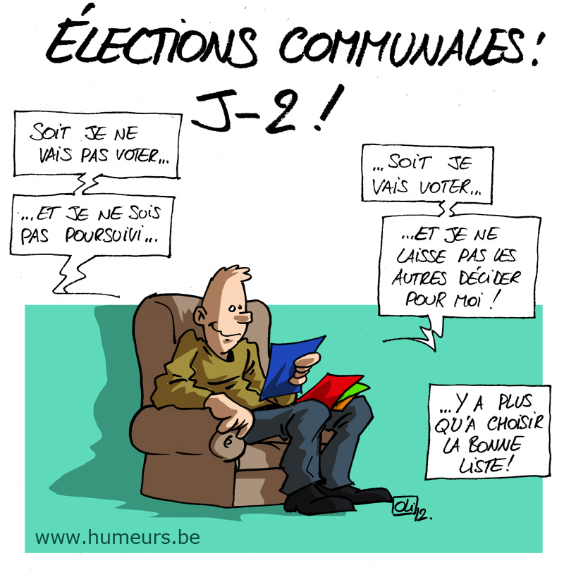 Ça y est, c’est ce dimanche 14 octobre qu’auront lieu les élections communales et provinciales. Le temps pour chaque citoyen d’aller exprimer son vote et son avis quant à la gestion passée et future de la commune et de la province. Un moment important, et obligatoire ! … et ce, même si la ministre de la Justice a affirmé que les personnes qui ne se présenteront pas aux élections ne seront pas poursuivies ! Une aberration de la part de la ministre ! Ceux qui ne se présenteraient pas devraient, non seulement être sanctionnés, mais également ne plus avoir le droit de se plaindre ou de critiquer la politique ! Et là, ça nous fera des vacances 😉 C’est vrai, on a l’occasion de s’exprimer et d’influer sur les choses, alors si on n’en profite pas… A bon entendeur… 😉