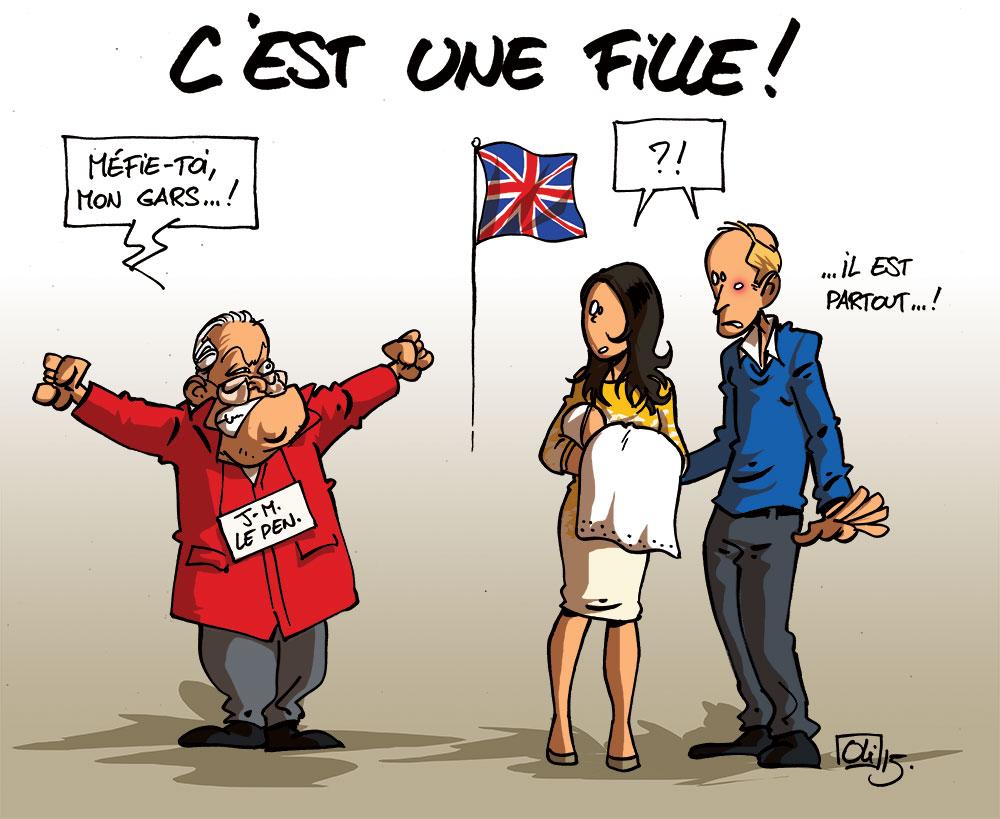 Ce dessin résume en gros l’actualité du WE ! Un premier mai tonitruant pour le FN en France, avec Femens au balcons, passage a tabac de journalistes et l’arrivée de Jean-Marie Le Pen, sur la scène, avec son manteau rouge, qui a ravi la vedette à sa fille, Marine. Et samedi, grande nouvelle en Grande Bretagne, puisque Kate et William ont donné naissance à une petite fille !
