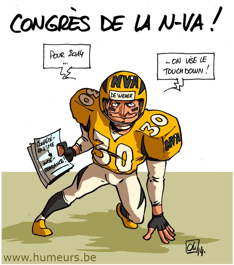 Le parti nationaliste de Bart De Wever, la N-VA, a terminé hier son congrès de 3 jours, durant lequel il a déterminé son programme pour les élections 2014. Le parti séparatiste est ainsi le premier à lancer les hostilités, et le moins que l’on puisse dire, c’est que ses ambitions sont claires : mettre en place son programme socio économique, viser les 30% et être au gouvernement. Pas de candidat premier ministre, et l’indépendance de la Flandres attendra ! Pour 2014, ce sera le confédéralisme ! Le congrès s’est d’ailleurs terminé par un vibrant « l’heure de la N-VA a sonné ! » Alors, Bart de Wever en mode « Super Bowl » ? Espérons que la N-VA ne remporte pas aussi facilement les élections que les Sea Eagles de Seattle n’ont humilié les Broncos de Denver hier soir (43-8) !