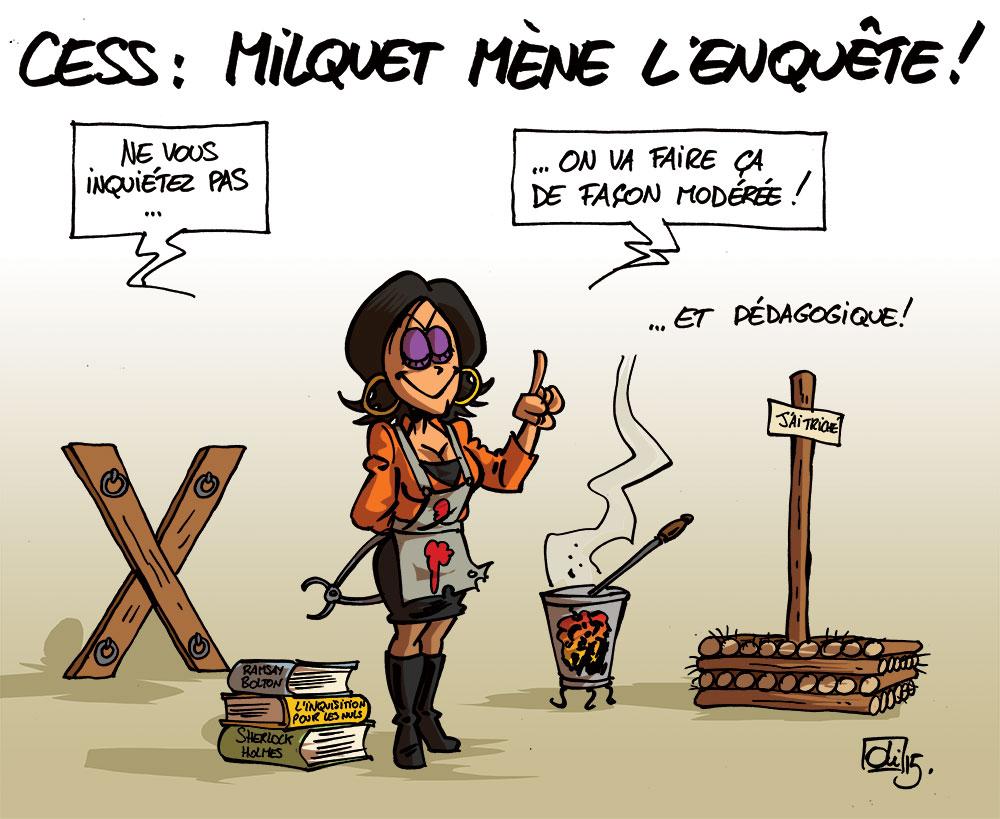 La ministre de l’enseignement, la CDH Joëlle Milquet, mène l’enquête afin de démasquer les coupables des fuites des questions du CESS sur Facebook. Quand elle n’est pas interrompue par des perquisitions à son cabinet…