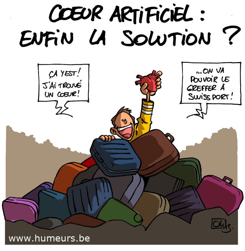 Une grande avancée a été faite dans la médecine : il est désormais possible de greffer des cœurs entièrement artificiels ! Les tests ont été réalisés avec succès sur des animaux, ils vont être pratiqués sur des êtres humains, dont un à l’hôpital Saint-Pierre, à Bruxelles, en Belgique. Actuellement, la greffe de cœur n’est possible que sur les hommes, car l’appareil est plus gros qu’un cœur normal, et ne rentre pas encore dans la cage thoracique d’une femme. Et si le cobaye pour le test de cette greffe de cœur c’était la société de bagagiste Swissport ? Ça faciliterait peut-être les discussions… 😉